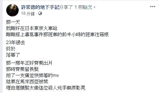 头发太像麻原彰晃 齐秦MV遭大马禁播 6 Jul , 2018 | 娱乐前线 1995年在日本发生的“东京地铁沙林毒气事件”,酿13死6000多人伤,主谋“奥姆真理教教主”松本智津夫(麻原彰晃)等7人今日(6日)已执行死刑,而当年这起震惊全球的事件,原来曾让歌手齐秦的MV在马来西亚被禁播。 台湾资深音乐人许常德在面书发文透露,事件发生的那1、2年正好碰上齐秦发片,一头长发的齐秦拍了《痛并快乐着》MV,普遍级的内容看起来没什么不妥,但MV却在马来西亚被禁播,理由是:“头发太像这位杀人凶手麻原彰晃”。 分享