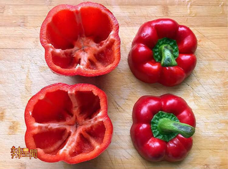 1.彩椒洗净从三分之一处切开,去除籽和筋膜备用。