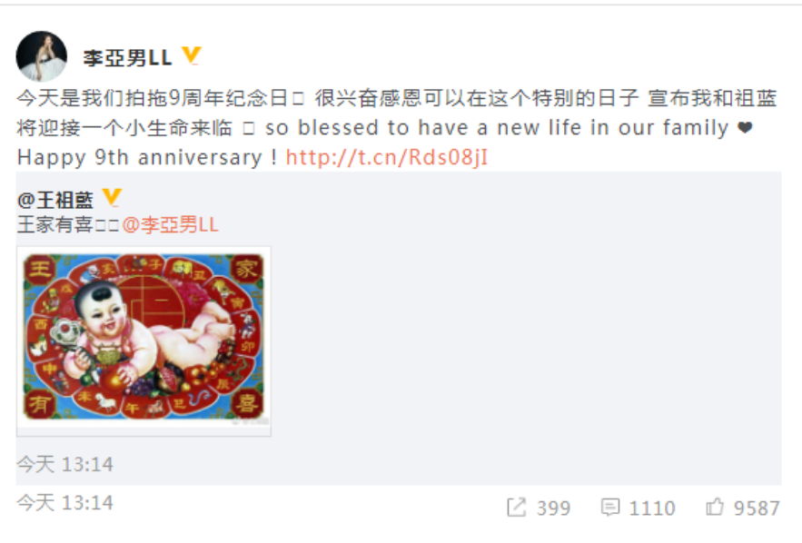 王家有喜!王祖蓝李亚男晒B超照宣布升级当爸妈 13 Jul , 2018 | 娱乐前线 王祖蓝于今天开心在微博宣布妻子李亚男怀孕喜讯:“王家有喜”,妻子随后转发晒出B超照并配文:“今天是我们拍拖9周年纪念日,很兴奋感恩可以在这个特别的日子,宣布我和祖蓝将迎接一个小生命来临。” 2014年11月19日,王祖蓝向女友李亚男求婚成功,二人于2015年情人节举办了婚礼。网民们随后纷纷留言恭喜王祖蓝和李亚男,有人更开玩笑留言道:“希望宝宝遗传爸爸的幽默妈妈的颜值身高”。 分享