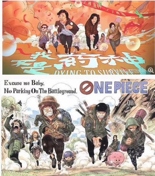 电影《我不是药神》破15亿的宣传海报也被指抄袭《航海王》,但制作方没回应。
