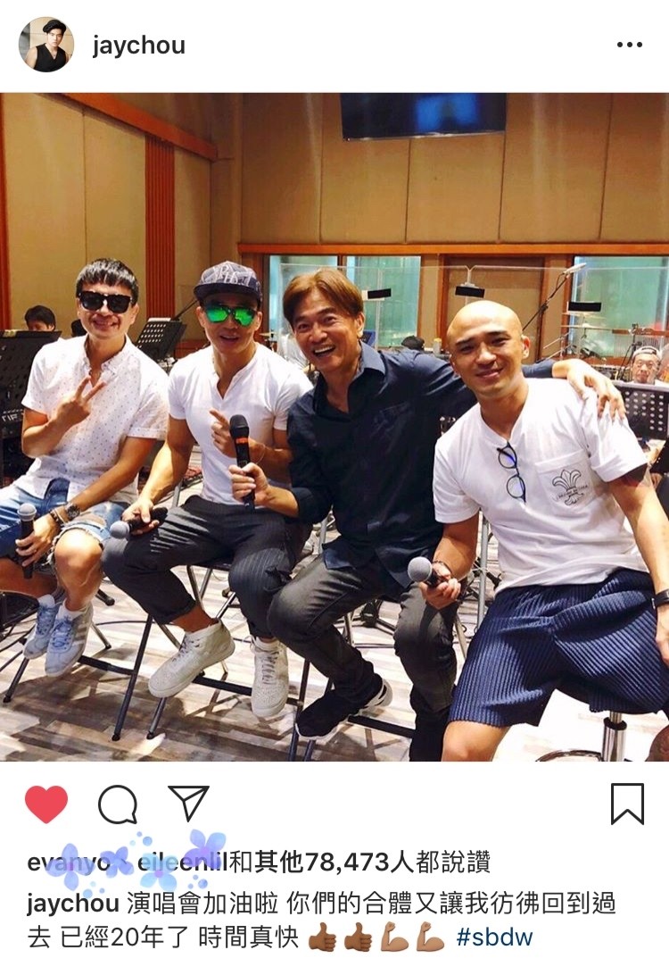 昨晚周董主动贴出咻比嘟哗合体照片,并写到:“演唱会加油啦!你们的合体又让我仿佛回到过去,已经20年了,时间真快。”