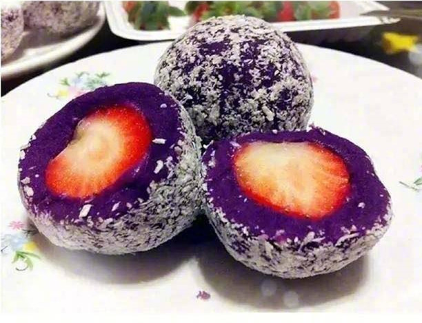 取一份紫薯包着一个草莓造型,在表面粘上椰蓉即可