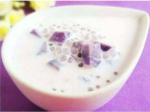 3.将椰汁牛奶西米紫薯中和一起搅匀,放冰箱冷藏后即可食