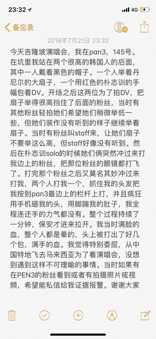 遭殴打的中国歌迷21日深夜演唱会结束后,在微博还原“被手机砸脸、肚子被踹”的现场过程。她表示凌晨已在马来西亚朋友陪同下去医院验伤,有脑震荡、鼻子也照了X光,身上的外伤医生也都写到报告里。她早上8时42分再发文,“另外一个被打的丹尼尔饭我并不认识,并且她不是中国人,她也许存在被打之后正当防卫这样的行为,我真的就是被打没有还手,现在在警局等负责的警察来。”随后更出示自己的报案文件。