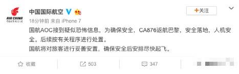 客机受恐吓折返 陈伟霆在机上! 27 Jul , 2018 | 娱乐前线 陈伟霆所乘回国航班接到疑似恐怖信息,已返航巴黎安全落地,稍晚他发微博报平安:等我们大家一起平安回国吧! 陈伟霆所乘回国航班接到疑似恐怖信息,已返航巴黎安全落地,人机安全,后续按有关程序进行处置,确保安全后安排尽快起飞。此消息曝光后,粉丝纷纷为陈伟霆表示担心,希望他一切平安。 稍晚,陈伟霆通过微博报平安称:“安全。等我们大家一起平安回国吧!”网友看到此平安微博后,纷纷留言表示松了一口气,称:“平安就好,等你回家!”“终于等到发博了,安心了,等你平安回国!”“我们等你回家!” 分享