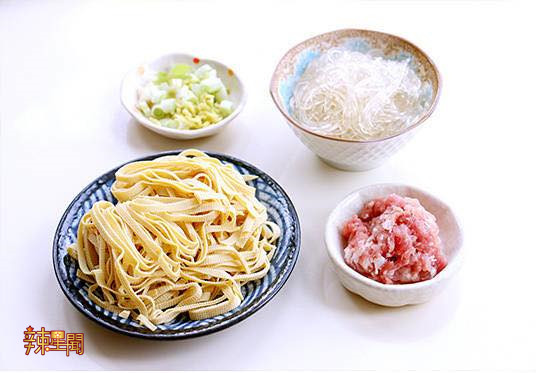 1.猪肉切碎、粉条泡软、豆腐皮切丝、葱姜切碎、青菜洗净。