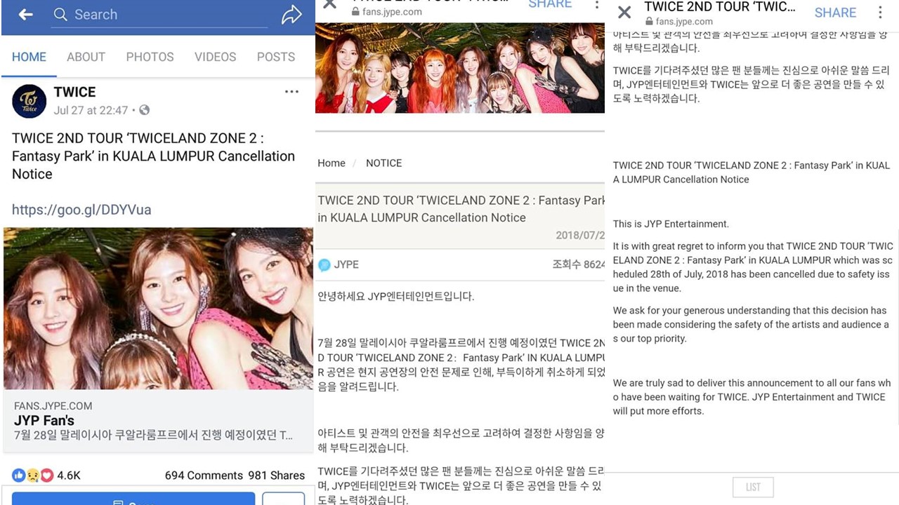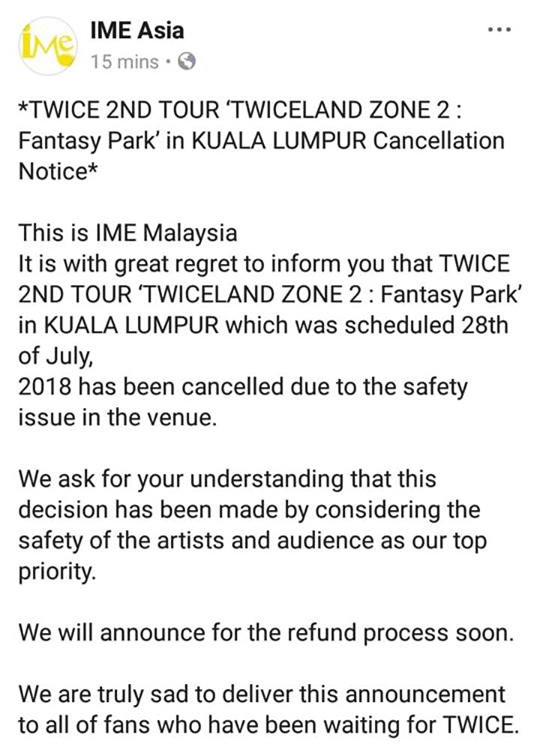 演唱会原定明晚(28日)8点30分在Satadium Malawati,Shah Alam举办,但今晚主办单位IME、TWICE都同时在脸书宣布最终因场地安全问题而被迫取消。