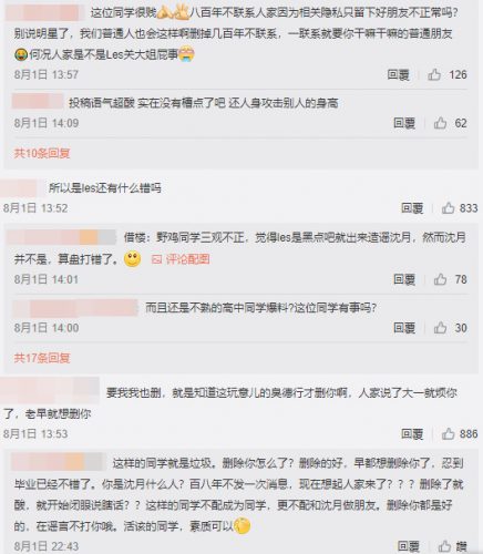 不过其他的网友倒是不以为意,认为就是有这种同学,难怪沈月会删好友,“八百年不联系,人家因为相关隐私只留下好朋友,不正常吗?更何况人家是不是les关你屁事。”爆料人士反而被群众酸根本是忌妒:“这样的同学留着不删要干嘛?”