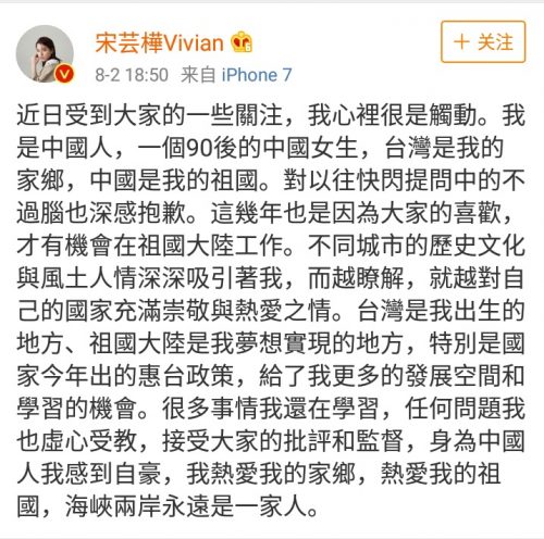 宋芸桦在微薄PO文:“近日受到大家的一些关注,我心里很是触动。我是中国大陆人,一个90 后的中国大陆女生,台湾是我的家乡,中国大陆是我的祖国”,并表示“这几年也是因为大家的喜欢,才有机会在祖国中国大陆工作。不同城市的历史文化与风土人情深深吸引着我,而越了解,就越对自己的国家充满崇敬与热爱之情”,不过文中提到“台湾是我出生的地方”,而祖国大陆是她梦想实现的地方,国家今年出的“惠台政策”,给了她更多的发展空间和学习机会。最后强调“身为中国大陆人我感到自豪,我热爱我的家乡,热爱我的祖国,海峡两岸永远是一家人”,言论引发极大争议。