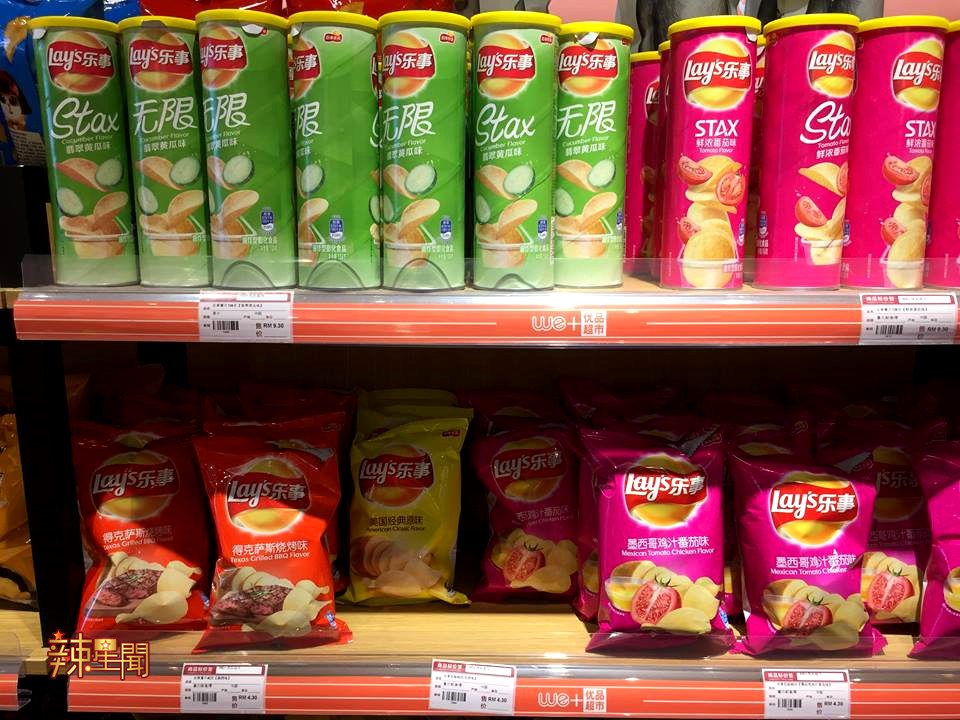 如奶瓶风味酸奶、兰芳园丝袜奶茶、透明可乐、Snickers巧克力饮料、奶咖先森风味布丁、中国版火鸡面、麻辣嫩牛自煮火锅套餐、格蕾美饮料、啪啪蜂蜜水、农夫山泉打奶茶、爆炸香辣蟹、青岛啤酒、康师傅及一度赞面食等等~