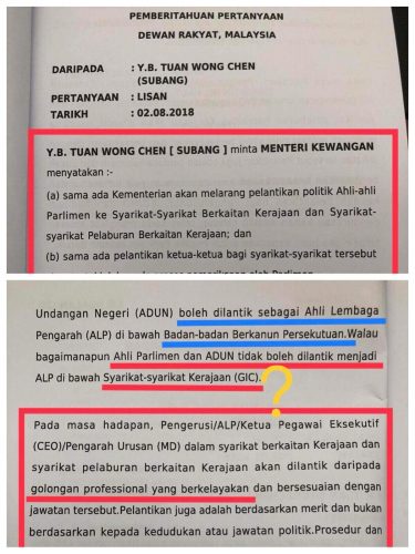 姑且不论为什么提问的是黄基全,却是魏家祥“鸡婆”的揭露首相明目张胆的违反内阁决定,也不谈明明写syarikat-syarikat kerajaan,做么又括弧注明“GIC”(在此被解读作Government Investment Corporation),但看首相本身“以身试法”的违反内阁决定,“无法无天”的做法引起的“骨牌效应”就够了。