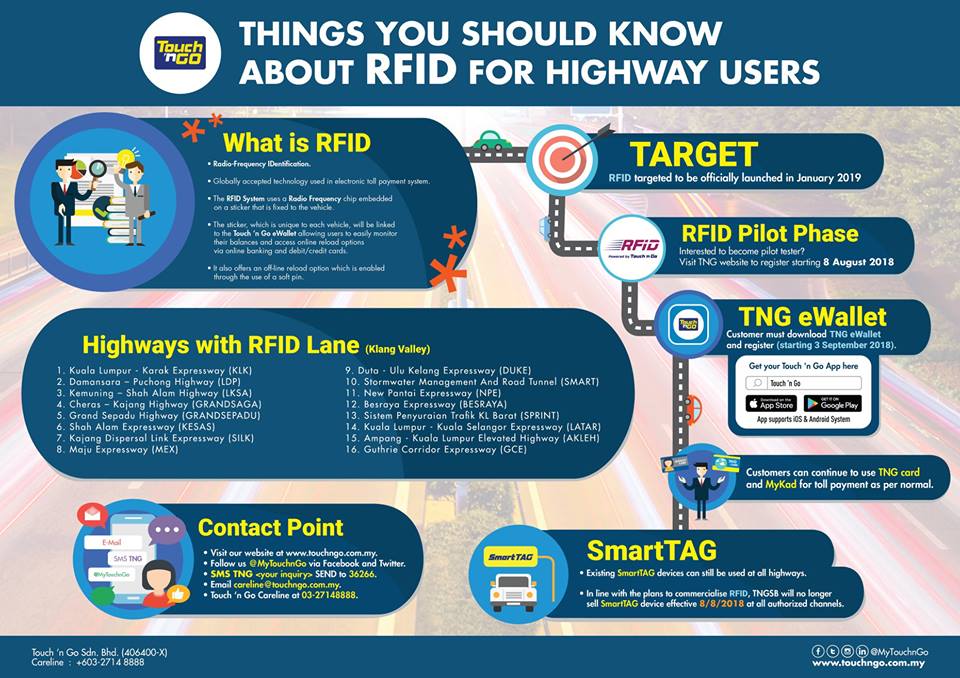 目前,巴生谷一带设有RFID的大道分别是吉隆坡-加叻大道、LDP、KESAS、大使路-DUKE以及BESRAYA。据报道,一触即通卡有限公司的代理从8月8日起,已停止出售SmartTag。不过,用户仍可以继续使用。