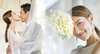 婚照所见,嘉颖拥着Grace的纤腰并亲吻其脸颊,Grace就双手环抱嘉颖的颈,面露幸福笑容,相当温馨,而另一张则是Grace轻吻嘉颖的鼻子,表现调皮,嘉颖笑到见牙不见眼及用双手圈着准太太,两人又在海天一色的背景中双双起舞,照片唯美浪漫!