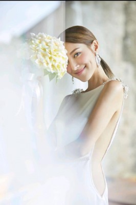 另外,Grace手拿白色鸡蛋花束成的花球拍照,鸡蛋花的花语是孕育希望及复活,寓意对婚姻生活充满希望。 Grace共换了两套婚纱,均极度性感,其中一套是大露背兼侧门大开款色,两侧的deep V开到腰以下近臀部,另一套婚纱的侧边亦开到腰间,以透视配合水晶刺绣,配合两对BVLGARI白金钻石耳环,明艳照人。