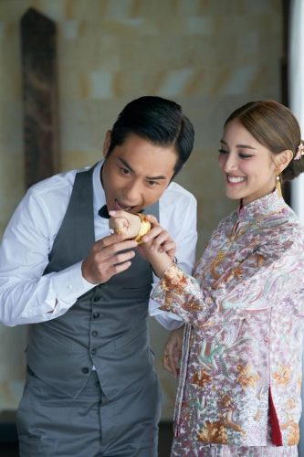 艺人郑嘉颖与陈凯琳(Grace)今日在峇里BVLGARI酒店,今天早上嘉颖进行接新娘仪式,为娶得美人归,他有求必应,在Grace要求下,他更唱出自己歌曲《一千个愿意》,又抱起Grace由走廊行入大厅,足足200呎路程,向双方家长进行斟茶仪式!虽然未有特别玩新郎环节,但嘉颖仍有给开门利事给众兄弟姊妹,至于花球则由新娘的一个圈外女性朋友接到。