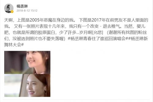杨丞琳在微博上晒出自己2005年和2017年的剧照,来了一波“回忆杀”。她配文道:“天啊,上图是2005年《恶魔在身边》的我,下图是2017年在《前男友不是人》里面的我。又有一张照片表现十几年来,我只有一个改变——退去稚气。当然,婴儿肥,也就是所谓的胶原蛋白,少了许多…岁月啊!(谢谢所有找图的粉丝们,没被选到照片也不要失落喔)。”
