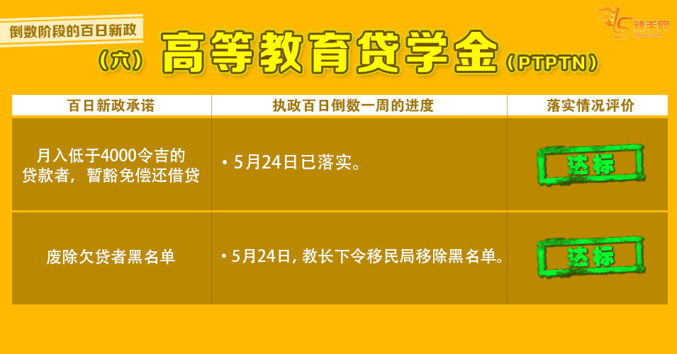 6)暂缓月入4000令吉以下的高教贷学金借贷者偿还贷款,废除欠贷者的黑名单;
