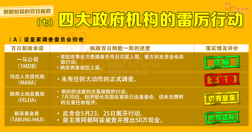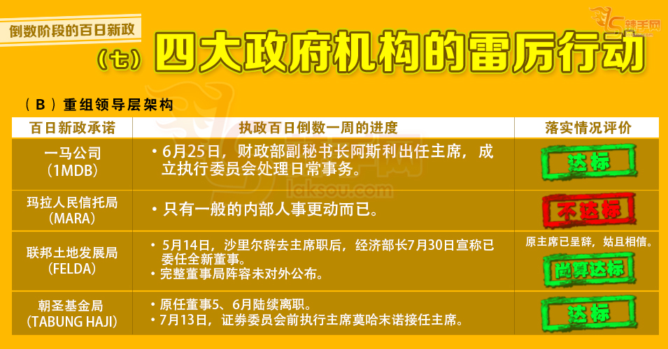 7)设皇家调查委员会彻查一马公司、玛拉人民信托局、联邦土地发展局和朝圣基金局,并且重组领导层;