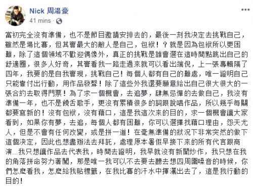 歌手周汤豪一首《帅到分手》红遍亚洲,近日他卸下艺人身份,以参赛者的姿态参加大陆嘻哈节目《中国新说唱》,过程中虽然实力曾受到质疑,但是他还是坚持参加,12日他在脸书上发长文道出参加节目的原因,就是希望可以跳脱舒适圈,挑战自己,“我只想在我的角落拼命努力着闯。”