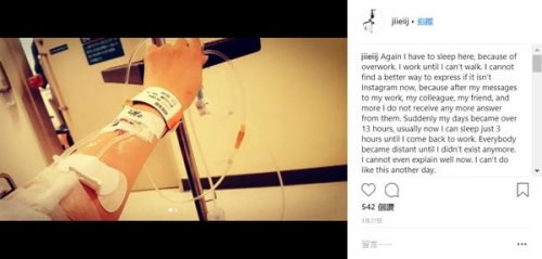 其实这位名叫Jie的YG职员,在今年3月27日就曾PO出两张照片,一张是她手打着点滴,一张背景有YG娱乐LOGO,她用英文写下“因为超量工作,我又得睡在这里,工作到无法走路,如果没有IG还真的找不到传达我心情的方法,因为即使我传讯给同事、朋友,都没有办法得到回应。”