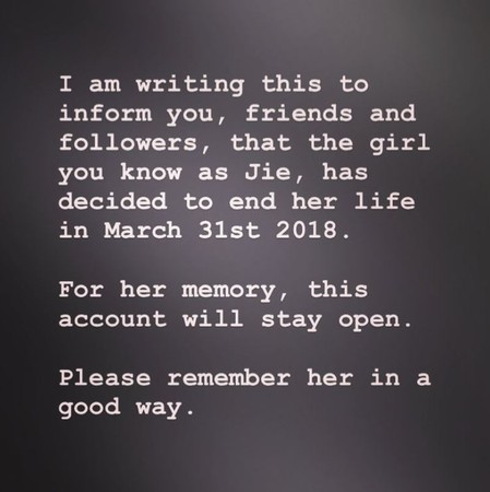 直到本月初,友人代为在她IG上发文,“我写下来告知大家,朋友们与追踪者,你们所知道的这个女孩Jie,已决定在2018年3月31日结束自己的生命。为了回忆,将会保留此帐号,请永远记得美好的她。”