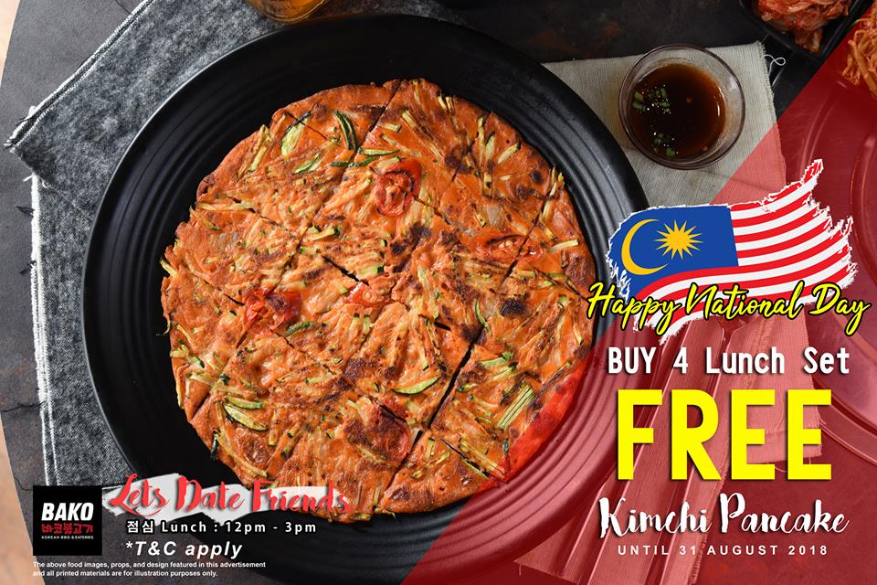 为庆祝国庆日,BAKO BBQ每天午餐时间,都会送出他们家最受欢迎的泡菜煎饼。你只要点四份Lunch Set即可享有。