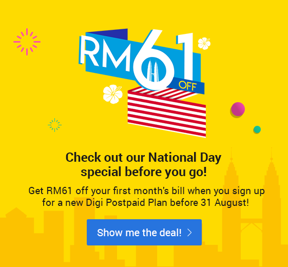 Digi国庆月推出特别折扣,你只要在8月31日前签购Digi后付配套,就可享有首个月月费RM61的折扣!
