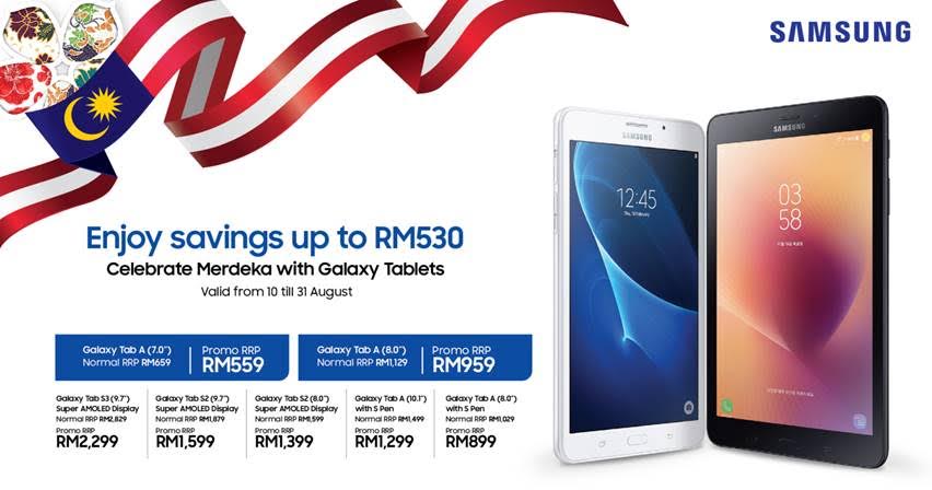 为欢庆我国独立第61周年,三星(Samsung)特别举办Glaxy Tab促销活动,为用户提供高达RM530的折扣!最低价RM559即可购得一部Galaxy Tab A!