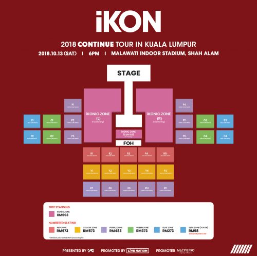 每一场的票价为 RM693 ( iKONIC/INNER CIRCLE 区), RM673 ( Red 区) , RM573 ( Yellow区), RM483 ( Purple 区), RM373 ( Green 区), RM273 ( Blue 区)。坚持对“音乐本无压力”的理念,一如既往,MacpiePro 将在这两场演唱会提供给年轻人最实惠的门票价格。凡是 18 岁以下的青少年即可以特别价格 RM98 购买 RM273 区域票的福利。