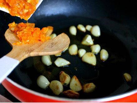 2.在锅中加入少许油,然后烧热,再放入大蒜小火炒成金黄色。