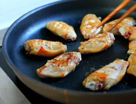 1.鸡翅用水冲洗后,加少许盐和料酒腌制一下,放入煎锅里煎至两面金黄色。