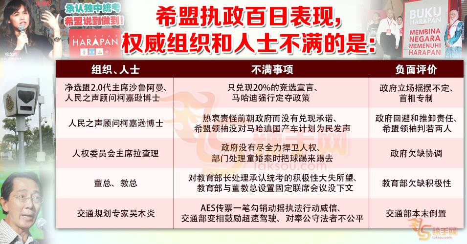 负评如潮的权威人士和组织可谓“粒粒巨星”,当中包括人权委员会、净选盟2.0、大马人民之声(Suaram)、董教总、交通规划专家吴木炎等,其中净选盟更毫不客气只给20分的超低分,董教总也直言“大失所望”。