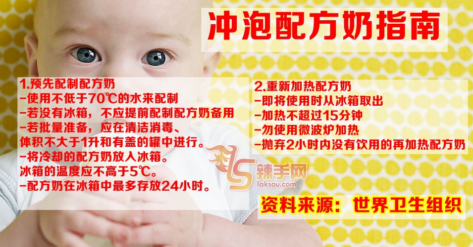 - 确保是在干净的环境下冲泡配方奶粉及相关器具(瓶盖、汤匙、罐等)的卫生