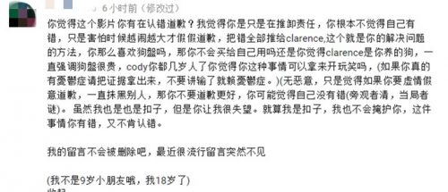 随后,Cody再次发布影片回应“狗盘事件”,他表明自己为了让影片更有趣而没有顾虑及Clarence感受,为了之前的不良行为赎罪 ,Cody在影片中同样使用狗盘喝水,可这举动不但没有平息网民的愤怒,反而更加激怒网民,“你就是怕事件闹大而假假道歉”,认为Cody不是真诚的向Clarence道歉。