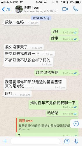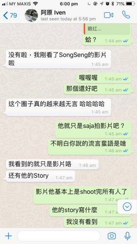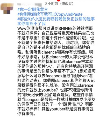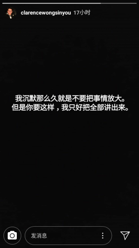 同时他也道出了和Clarence认识的经过,以及他们因狗盘事件的对话记录,他提到曾经把Clarence当兄弟,并把自己有轻微忧郁症的事情告诉对方,可没想打对方却在外头把他有病一事到处宣扬。随后有眼见的网民发现Clarence发布了个人IG快拍,内容写道:“我沉默那么久就是不要把事情放大,但是你要这样,我只好把全部讲出来”。