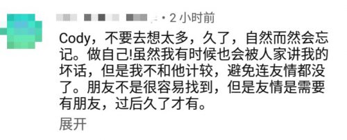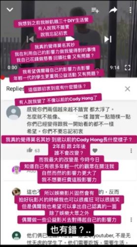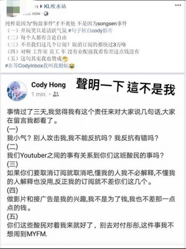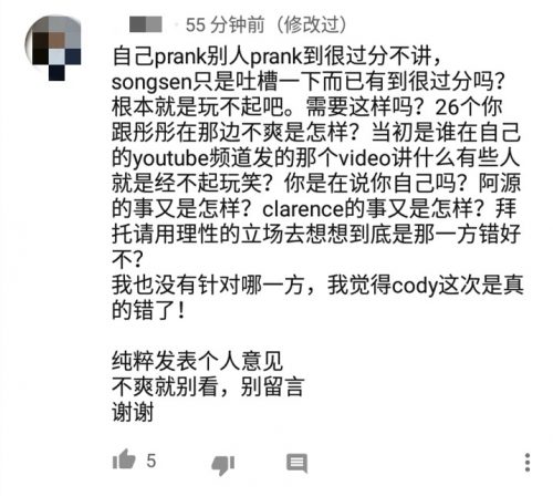 Cody在影片中回应宋圣吐槽一事,并表明对宋圣并没有敌意,自己也没有特别在意被吐槽。他表示引发争议的是宋圣所拍的第二则名为“回应酸民攻击和吐槽”影片,他认为宋圣在影片中把他个人IG快拍内容给断章取义有抹黑成分,他澄清自己是针对一则泰国霸凌新闻而发表个人想法,他更强调“内容与宋圣没有关系”,可宋圣却对号入座,甚至把他的IG内容大做文章。