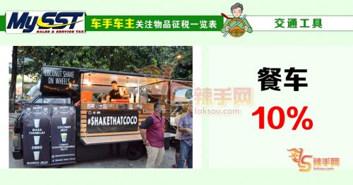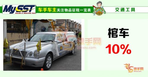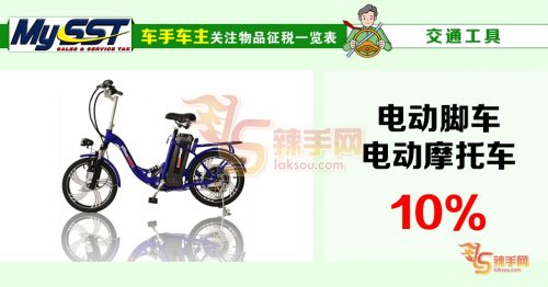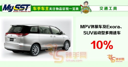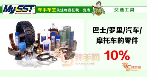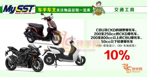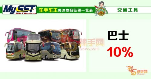 被征收10%SST的交通工具包括:巴士、电动脚车、电动摩托车、餐车、棺车、CBU柴油动力罗里、50cc以下轻便摩托车、CUB短尾车及Myvi、CBU及CKD的Sedan轿车、CBU及CKD的越野摩托车、200至250cc的CKD摩托车、200至800cc以上的CBU摩托车、MPV休旅车及Exora、SUV运动型多用途车、巴士/罗里/汽车/摩托车的零件等等(CBU-原装进口、CKD-本地组装)
