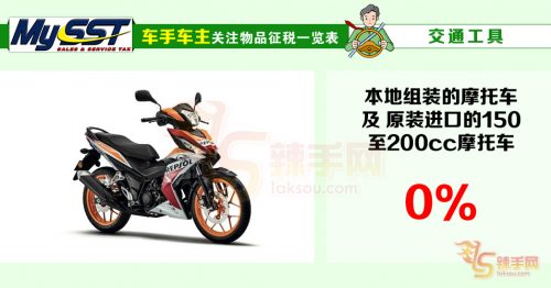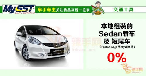 被豁免SST的交通工具主要是:本地组装的Sedan轿车、短尾车(Proton Saga、Myvi除外)、本地组装的摩托车 及原装进口的150至200cc摩托车