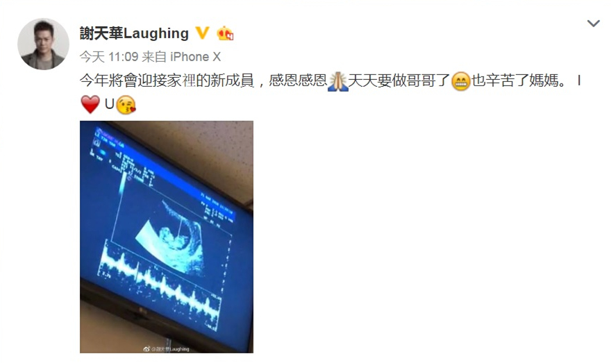 昨天早上11时,谢天华在微博公布,现年45岁的再度怀孕的喜讯,他在微博贴出一张超声波照片,显示太太腹中怀有身孕,谢天华更开心留言表示:“今年将会迎接家里的新成员,感恩感恩,天天要做哥哥了,也辛苦了妈妈。I LOVE U。”不少网友见到都立刻留言恭喜他,更有人看见超声波照片后,估计这胎还是儿子。