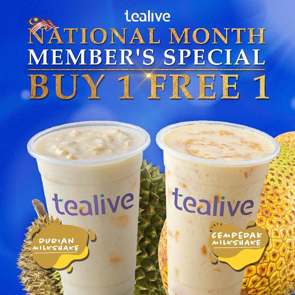 这项促销只限Tealive会员。凡会员购买特定口味,如Durian Milkshake及Cempedak Milkshare,即可享有买一送一优惠!不如,现在就jio朋友一起去买来喝吧!