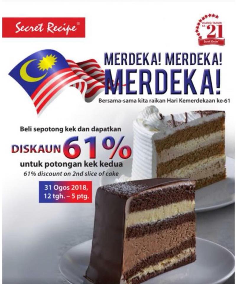 这项促销只限8月31日(中午12时至傍晚5时)。当你购买第二个切片蛋糕时,即可享有61%折扣!每名顾客限定购买4片切片蛋糕,并且只能选择Regular、Premium和Square Cake Slices。