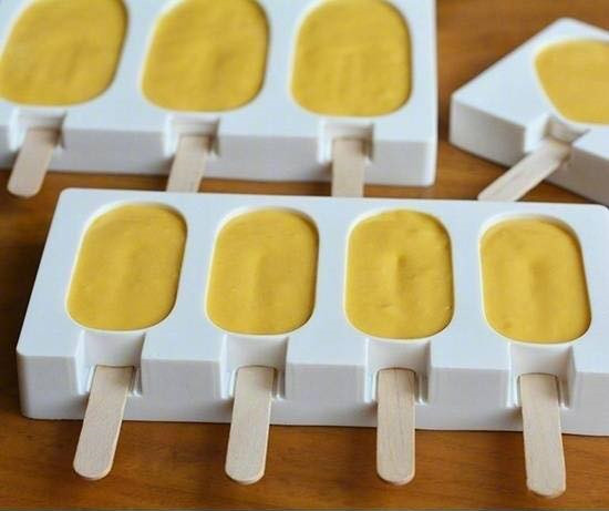 5.将完成后的芒果酸奶倒入模具中9分满,再将小棍插入,入冰箱冷冻直到完全凝固后取出。