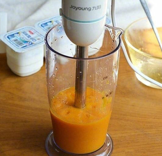 1.芒果剥皮切丁搅成泥。