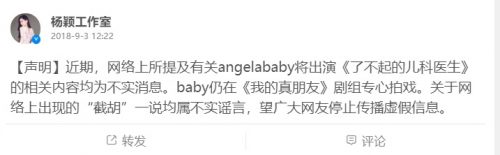baby截胡《了不起的儿科医生》?工作室:是谣言 3 Sep , 2018 | 娱乐前线 Angelababy工作室就网络上所提及有关angelababy将出演《了不起的儿科医生》的不实消息发声明。 正文中称:baby仍在《我的真朋友》剧组专心拍戏。关于网络上出现的“截胡”一说均属不实谣言,望广大网友停止传播虚假信息。 分享