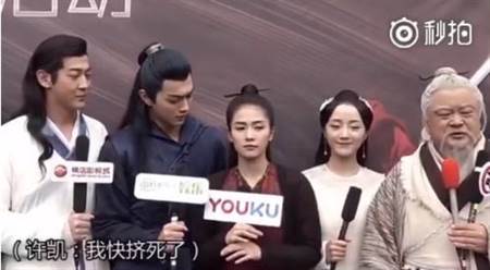 陆网今疯传许凯一段影片,他看似是出席记者会,一旁老演员在夸奖年轻演员:“平时说小鲜肉不能吃苦,说真的我在这剧组真没感受到”,一旁的许凯竟忘记手拿麦克风,向身旁的女星抱怨“我快挤死了”。