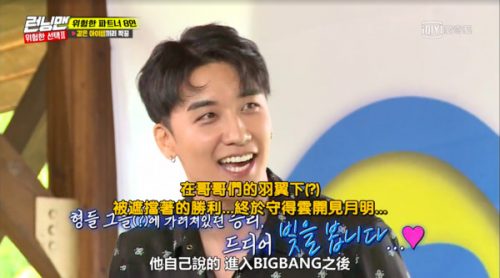胜利2日出演《Running Man》,综艺感十足的他,趁着哥哥都不在,竟隔空向G-DRAGON呛声,他笑说:“出道13年来,以前不认识我的人,现在才知道我是谁。”自从BIGBANG哥哥们一个一个入伍后,他的人生迎来全盛期。