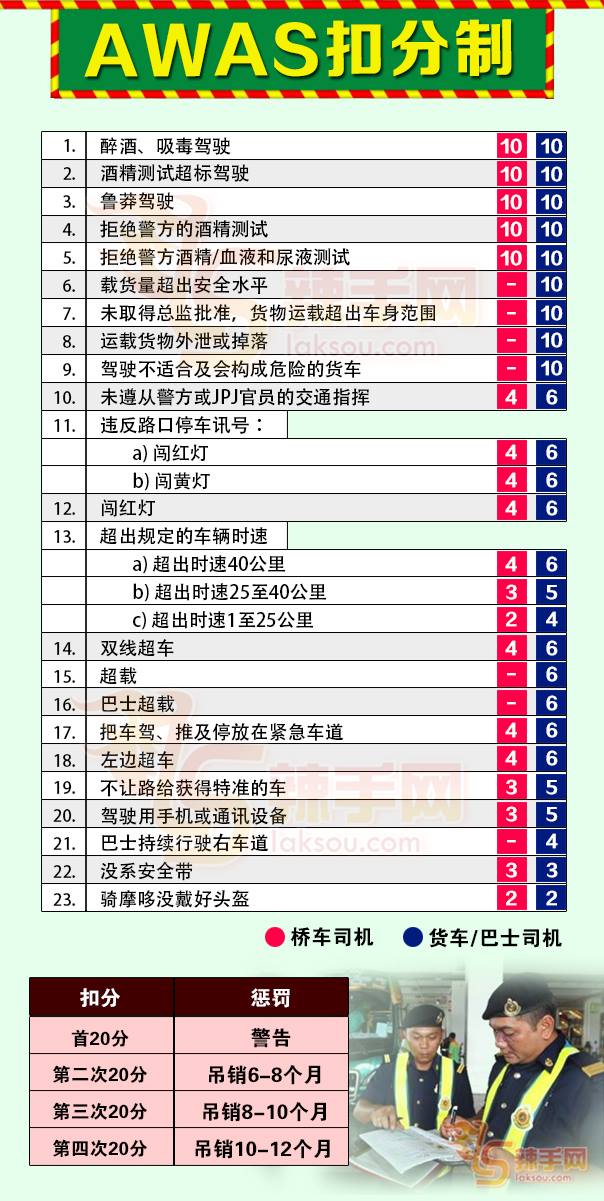 针对货车及巴士,超速是扣4、5、6分,闯红灯则扣6分。