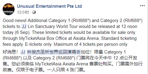 Unusual Entertainment Pte Ltd昨日在面子书公布林俊杰演唱会加位子。