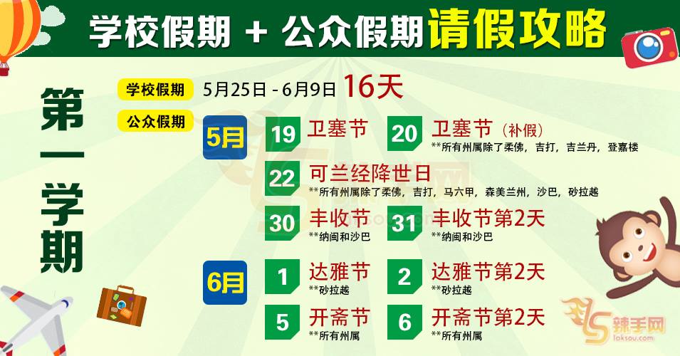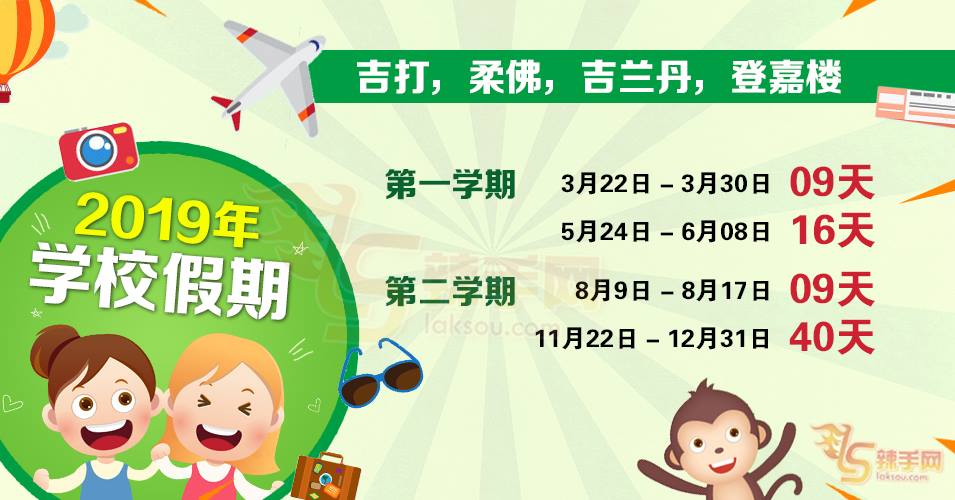2019年学校假期出炉! 7 Sep , 2018 | 民生百事 教育部发布了2019年全国学校上课及假期时间表,2019年学子们上课天数有214天(与吉隆坡同组周属),放假151天(假期73天/周末或公假休息78天)。 吉打、柔佛、登嘉楼、吉兰丹的学子则是上课213天、放假151天。 《辣手网》还将有碰上学校假期的公共假期结合,方便家长们安排假期与孩子们出游。 趁这几天机票便宜,赶紧计划明年的出游吧! 分享