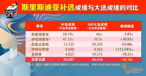 上届大选,结合伊党、巫统和独立人士,得票率都还不及三分之一,但补选的在野得票率却明显上升,在朝的希盟得票率则下跌7.81%,跌破60%水平线,对希盟构成威胁。斯里斯迪亚投票率同样低,但巫裔选民比华裔更勇于和明确的表达不满,非但不认同州政府平平无奇表现,也不满中央政府的施政方针和成效。